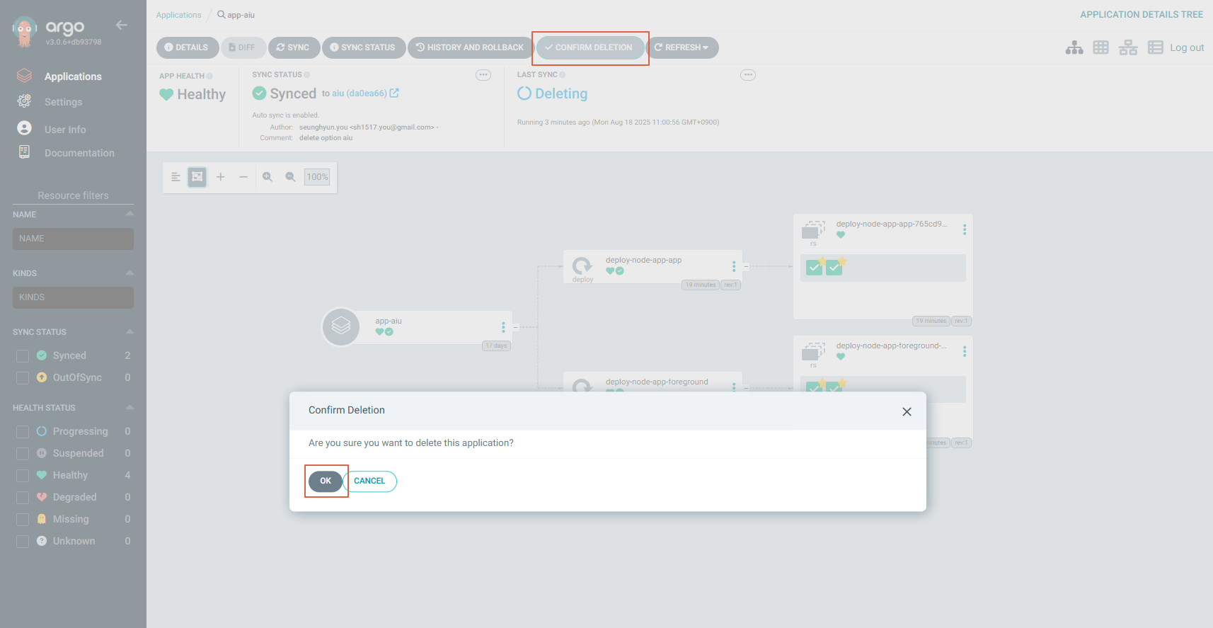 false 대신 confirm 값을 할당하게 될 경우 ArgoCD Application을 삭제할 때 GUI 화면에서 Confirm 버튼이 추가된다.