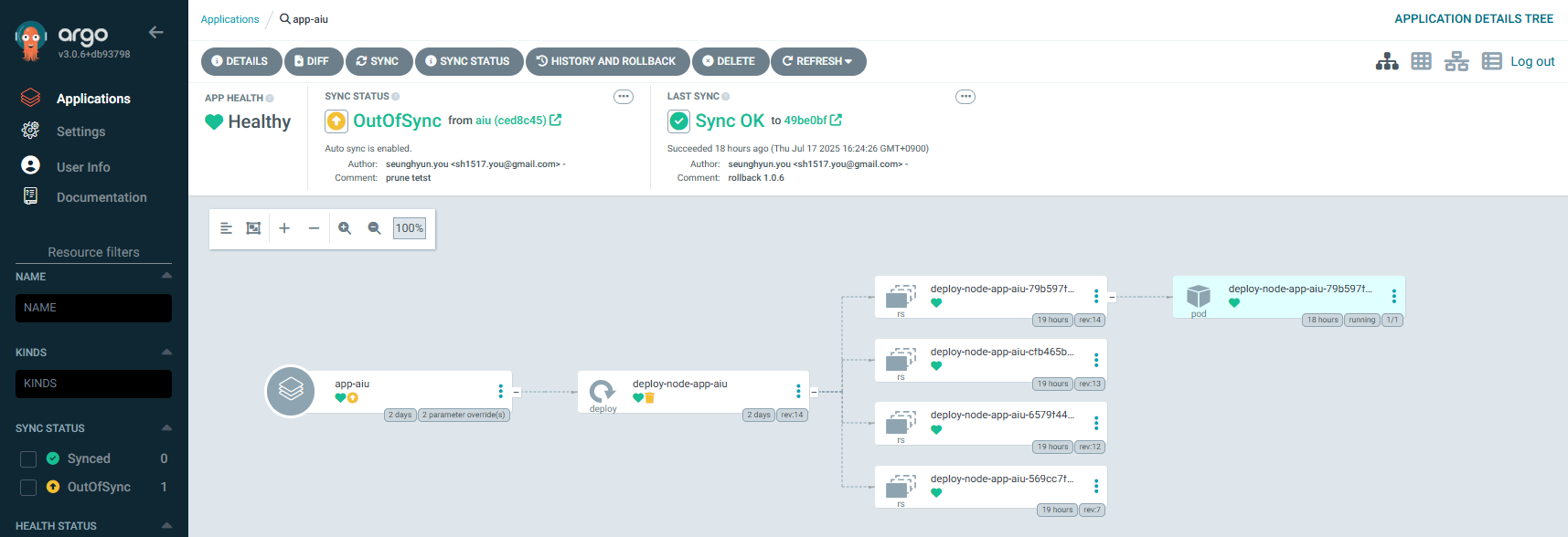 - Out of Sync 표시된 리소스는 ArgoCD Web UI에서 삭제하거나 kubectl 명령어로 삭제하면 Sync 상태로 돌아온다.