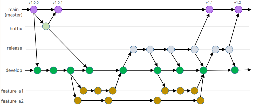 개발 프로세스에서 어떤 브랜치를 구성하고 관리할지에 대한 규칙과 가이드라인이다. 다수의 개발자가 협업하는 환경에서는 개발 팀의 코드에 대한 효율적인 관리와 협업을 위한 체계적인 방법이 필요한데, 이 때 여러 브랜치로 나누어 관리하는 방식이다.