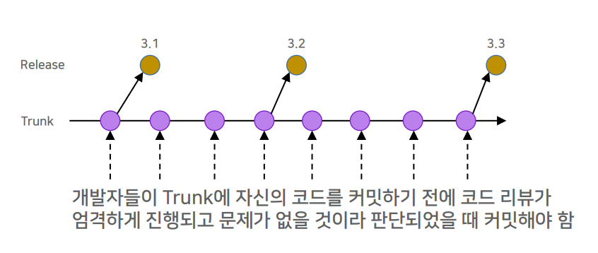 단일 브랜치로 구성해 코드를 관리하는 전략이다. 단일 브랜치에 직접 개발자의 코드를 병합한다. 핵심은 짧은 시간 단위로 병합이 이루어지도록 관리하는 것이다. 병합 전에는 항상 코드 리뷰를 진행하는 문화가 정착되어 있어야 하는데, 짧게는 몇 시간 길게는 하루 단위로 병합을 진행하면서 충돌이 발생하더라도 영향이 작은 코드를 주기적으로 병합하는 방식이다. 병합 후에는 자동으로 CI 시스템을 통해 빌드/테스트/통합 과정을 거치는데 문제가 없을 경우 운영환경에 배포된다.