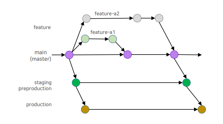 | staging | ○ | • 운영 환경 배포 전 QA와 UAT 진행에 사용되는 브랜치 |